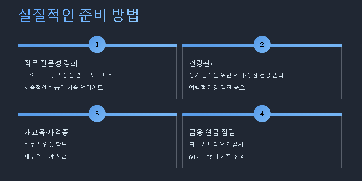 1) 직무 전문성 강화 — 나이보다 ‘능력 중심 평가’ 시대 대비 2) 건강관리 — 장기 근속을 위해 체력·정신 건강 관리 중요 3) 재교육·자격증 취득 — 직무 유연성 확보 4) 금융·연금 점검 — 퇴직 시나리오를 60세→65세 기준으로 재설계 정년이 늘어날수록 개인의 경력 유지 능력이 더욱 중요해지고 있습니다.