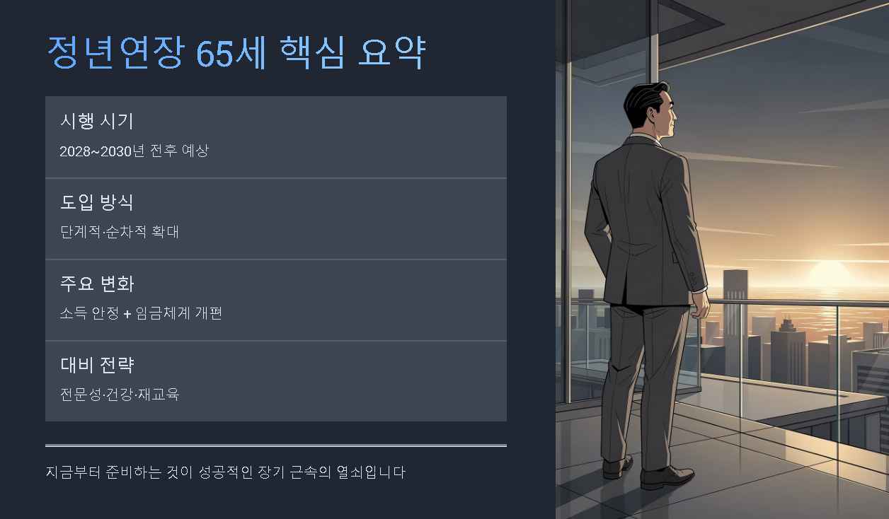 정부는 정년을 한 번에 65세로 올리기보다, ● 직종별·업종별 순차 적용 ● 기업 규모에 따른 단계적 도입 ● 60세→62세→65세와 같은 점진적 상향 방식을 검토하는 것으로 알려졌습니다. 이는 갑작스러운 기업 부담을 줄이고 노동시장 충격을 완화하기 위한 조치입니다.